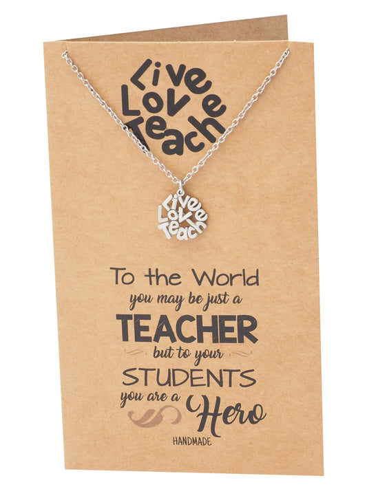 Camille Teacher Necklace Live Love Teach Pendant Best Gift for Teachers, Rhodium Plated Jewelry
