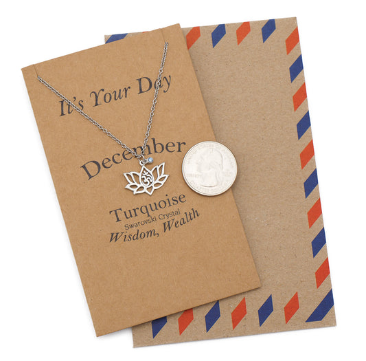 December Birthday Cards Lotus Flower Birthstone Necklace and OM Symbol