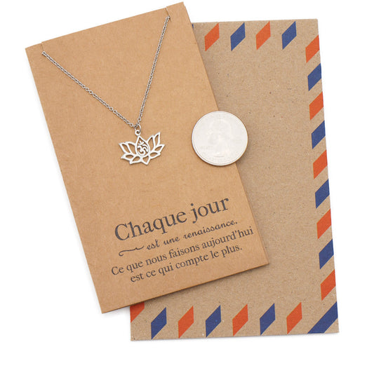 Edith Yoga Jewelry, Lotus Flower Om Necklace with French Yoga Quotes