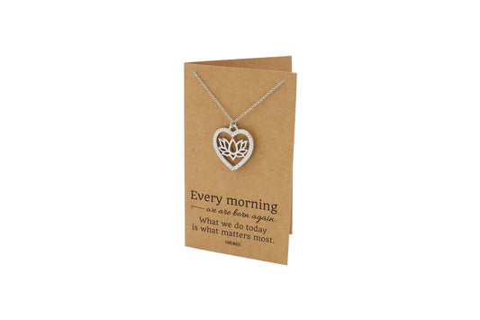 Draya Lotus Flower in Heart Pendant Necklace, Gifts for Women with Greeting Card, Rhodium Plated