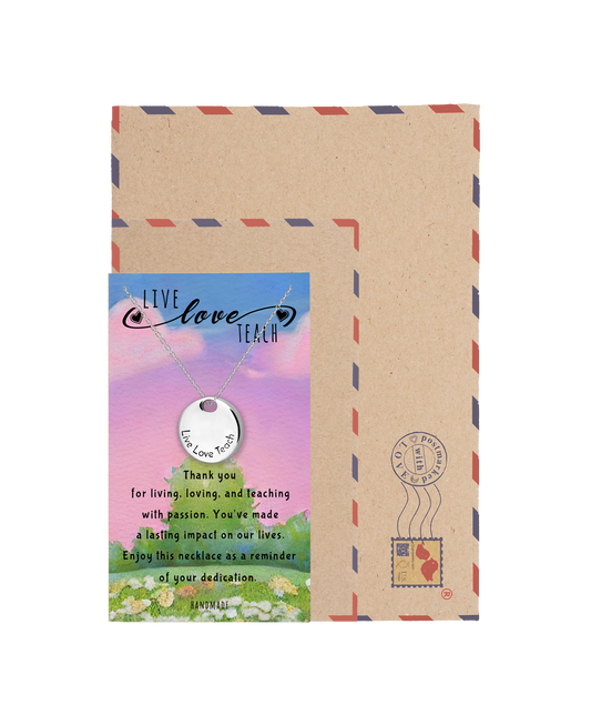 Jane Live Love Teach Round Plate Pendant Necklace, Thank you Appreciation Gift for Teacher, Mentors, With Inspirational Message Card