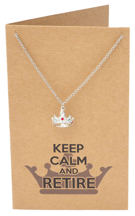 Jaimee Queen's Retirement Necklace with Crown Pendant, Keep Calm and Retire Jewelry Greeting Card