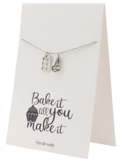Quinnlyn & Co. Gifts for Mom Measuring Spoons Pendant Necklace, Funny Baking Pun Quote Card, Stainless Steel, 16 inches to 18 inches