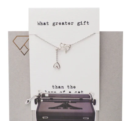 Quinnlyn & Co. Lorie Cat with Hanging Heart Pendant Necklace, Handmade Gifts for Women with Inspirational Quote on Greeting Card