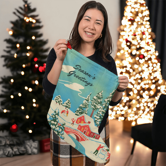 Season's Greetings Vintage Christmas Stocking | Retro Winter Village Holiday Decor