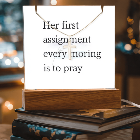 “Her First Assignment Is to Pray” Cross Necklace & Keepsake Display - Faith-Inspired Gift of Grace, Devotion & Morning Peace