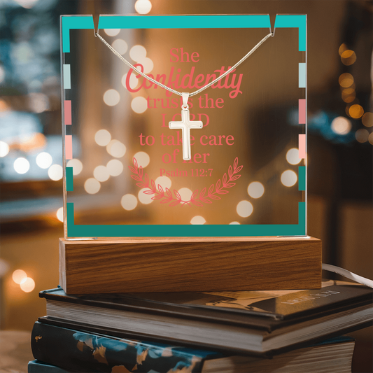 She Confidently Trusts the Lord Keepsake Acrylic and Cross Necklace Gift for Faith, Strength, and Inspiration