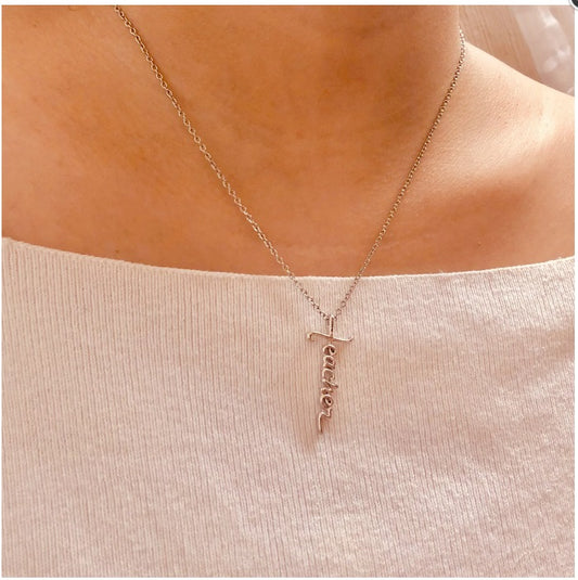 Joyfulle Aaron Teacher Script Pendant Cross Necklace, Handmade Gifts for Teachers with Inspirational Quotes on Greeting Card, Rhodium Plated