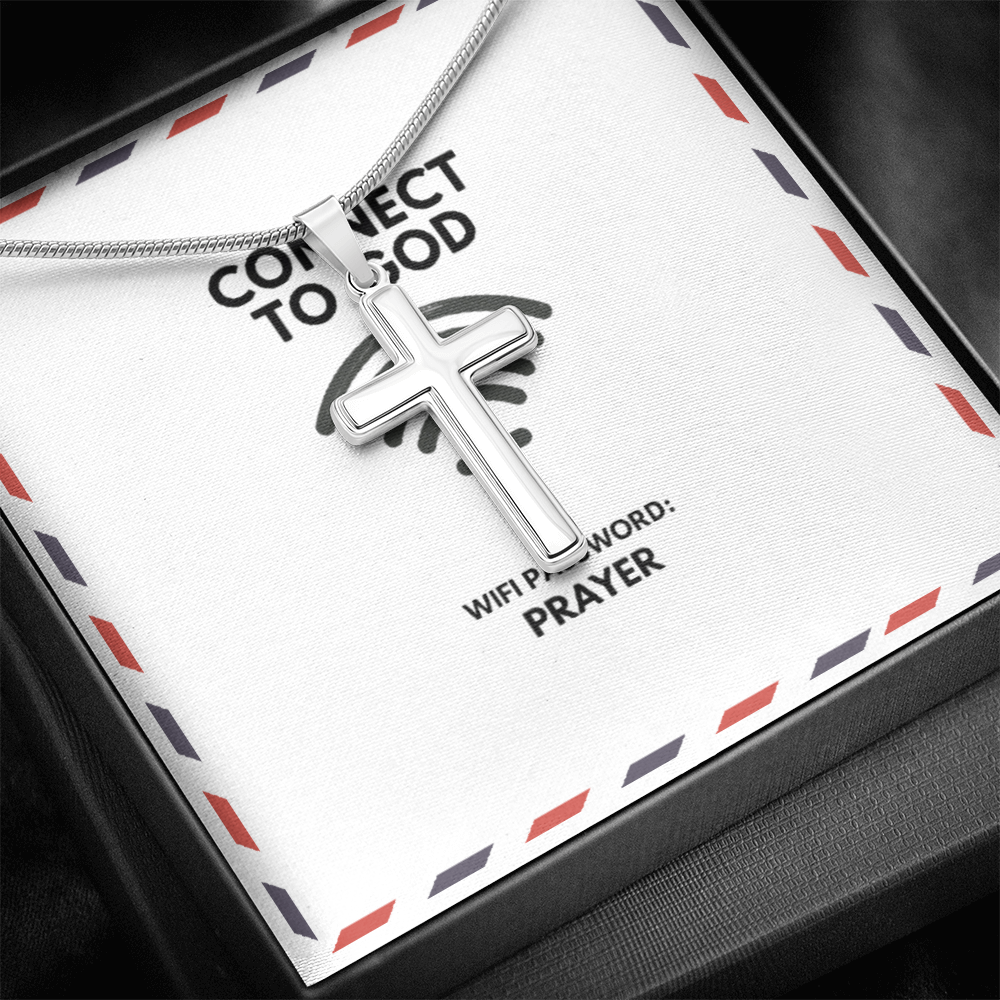 “Connect to God – WiFi Password: PRAYER” artisan cross necklace