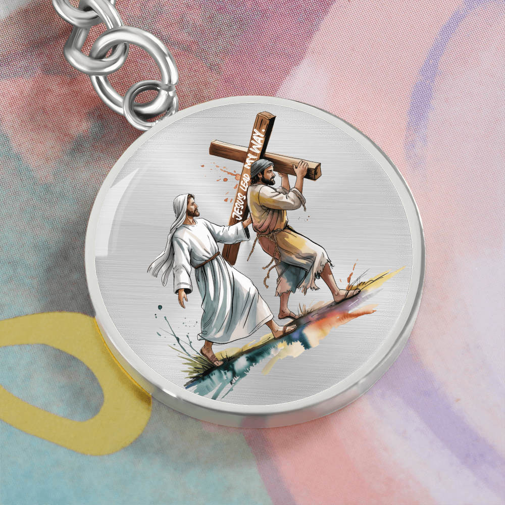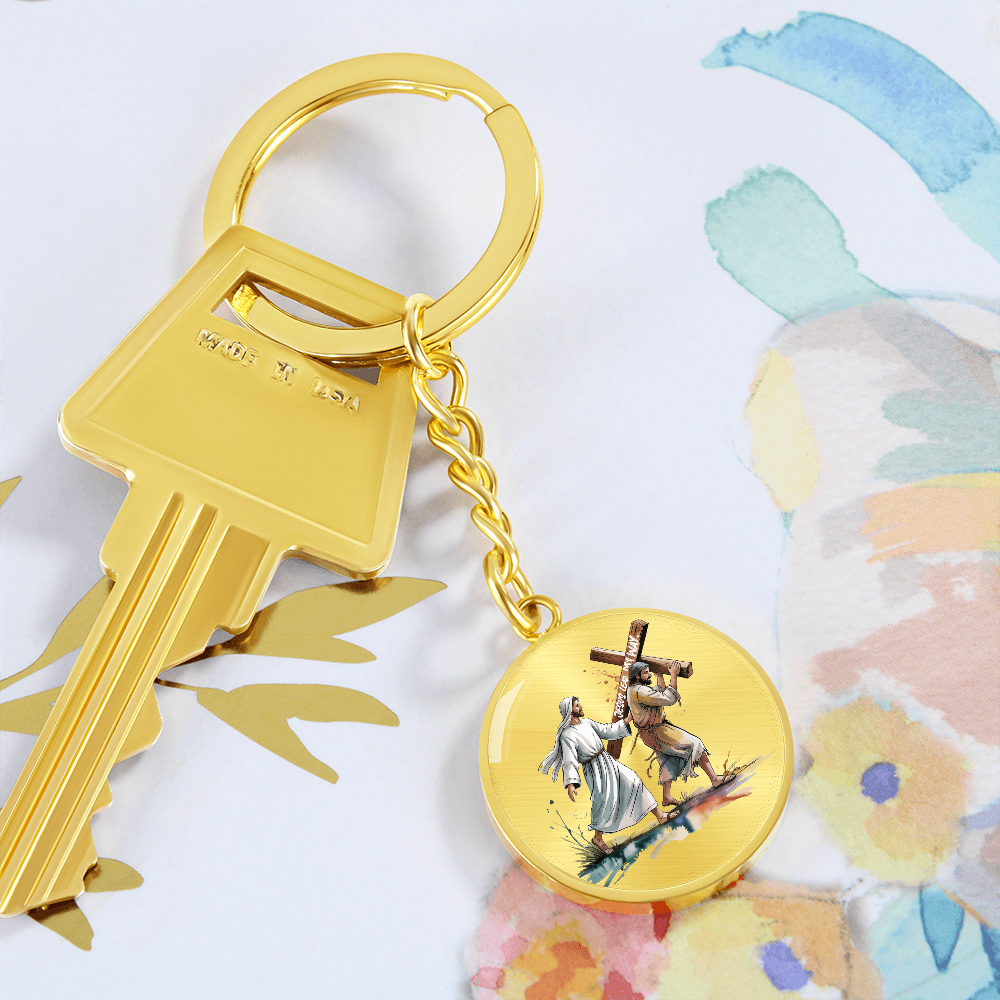 Featuring a powerful hand-drawn illustration of Jesus helping a man bear his cross, this keychain is more than an accessory…