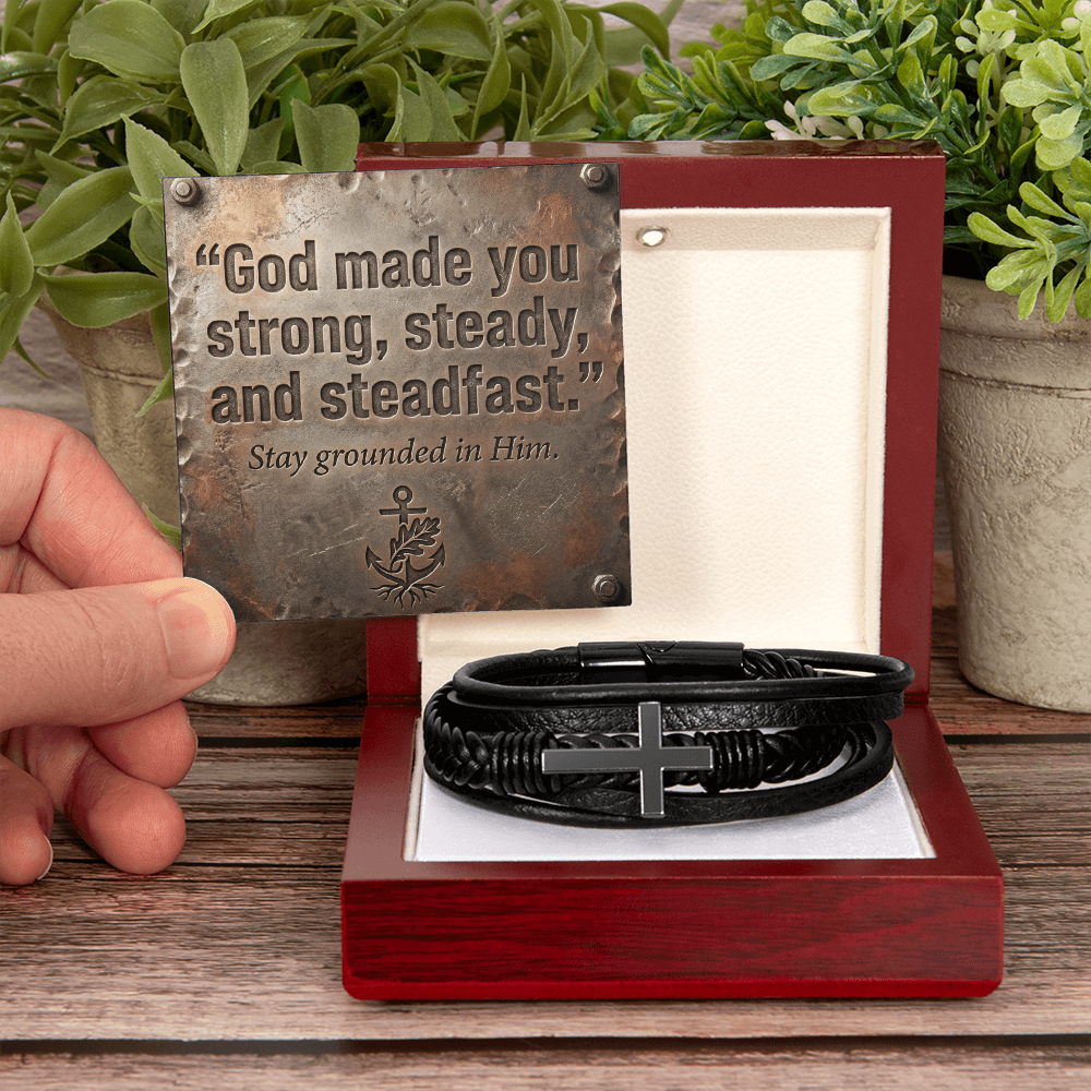 Give him a reminder of who God created him to be. This Men’s Cross Leather Bracelet, paired with the powerful message “God made you strong, steady, and steadfast. Stay grounded in Him,” is a meaningful gift for any man seeking courage, stability, and spiritual grounding.